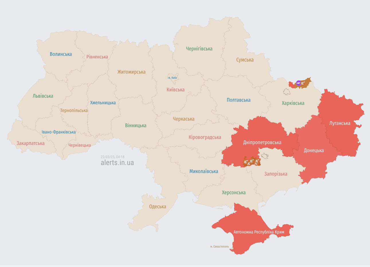 По состоянию на 04:18 карта воздушных тревог Украины выглядела так: