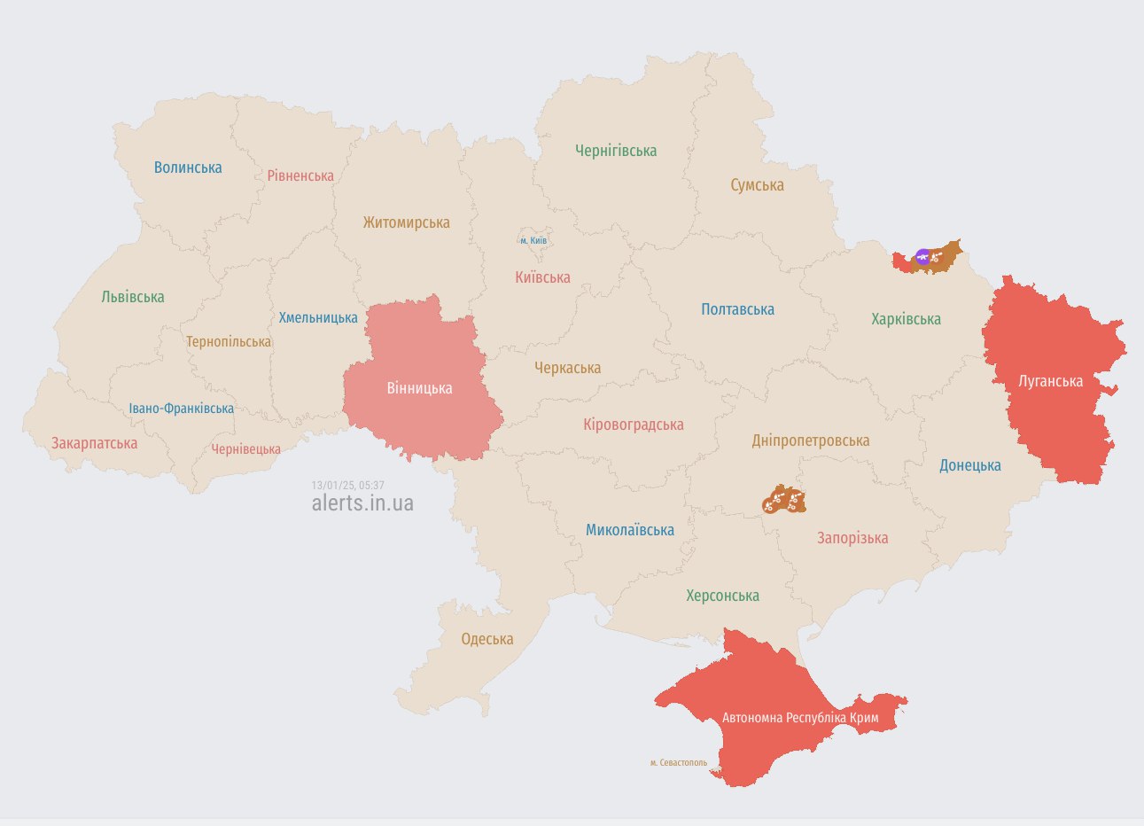 По состоянию на 05:33 карта воздушных тревог Украины выглядела так: