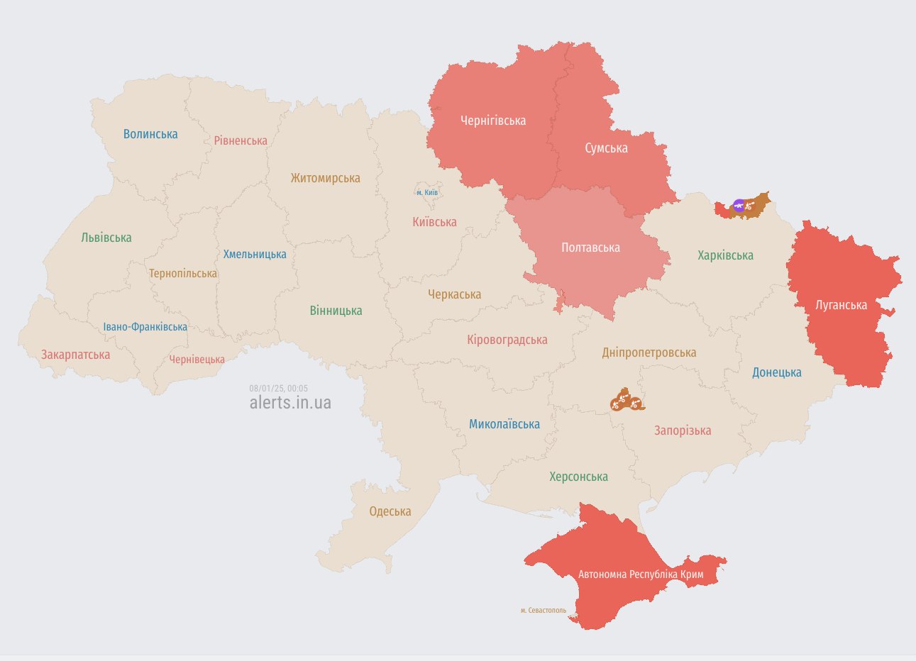 По состоянию на 00:05 карта воздушных тревог Украины выглядела так: