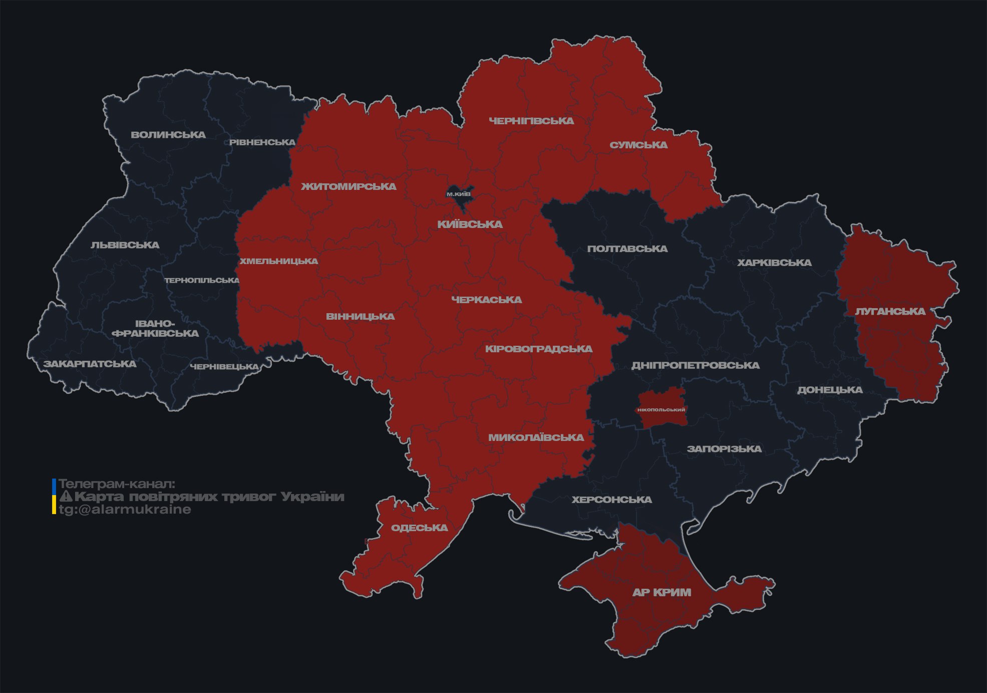 По состоянию на 00:55 карта воздушных тревог Украины выглядит так: