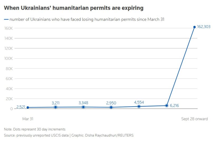 Гуманитарная программа, введенная в апреле 2022 года, позволила почти 260 тысячам украинцев въехать в США на начальный двухлетний период. Это небольшая доля от 5,9 миллиона украинских беженцев по всему миру, 5,3 миллиона из которых находятся в Европе, согласно данным ООН по делам беженцев.