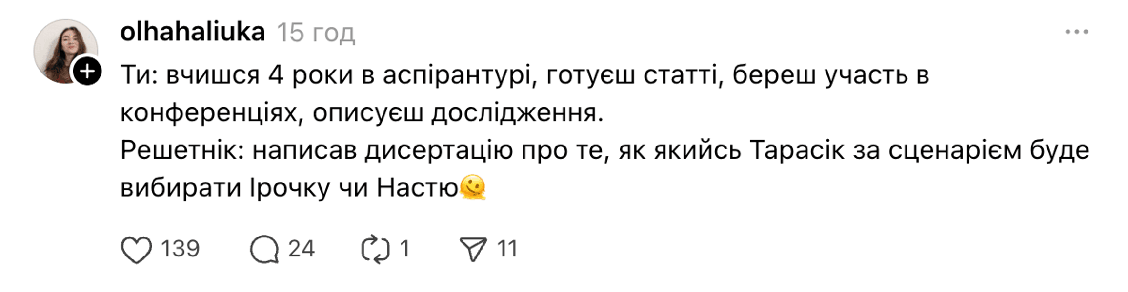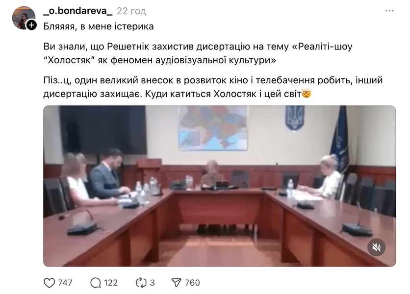 Диссертация объемом 217 страниц состоит из трех глав. В первом речь идет о реалити-шоу как культурном феномене — от истории формата до его адаптаций в разных странах. Вторая глава посвящена анализу "Холостяка" как международного проекта, а третья — особенностям украинской версии программы.