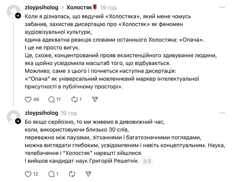 - "У меня лично не вызвало замечаний или хейта к диссертации, как факту. Это же ваше личное дело. Прочитав содержание у меня вызвали возмущение некоторые аспекты, потому что последние комментарии 14 сезона Холостяка, если не полностью, то существенно нивелировали моральные аспекты, которые вы исследовали в третьем разделе своей работы. Тема в целом достойна исследования, возможно, Вы самый осведомленный человек в сфере, но некоторые углы и вопросы, которые подняты в диссертации, вызывают вопросы с точки зрения научной ценности".