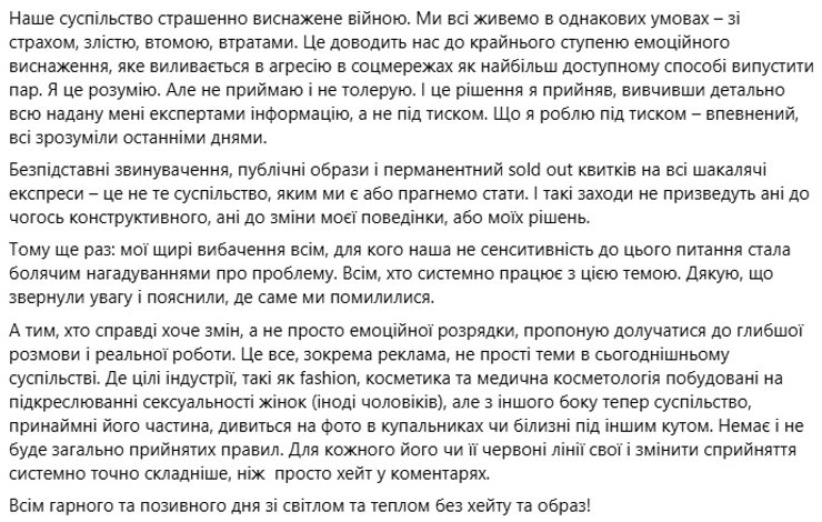 "Беспочвенные обвинения, публичные оскорбления и перманентный sold out билетов на все шакальи экспрессы — это не то общество, каким мы являемся или стремимся стать. И такие меры не приведут ни к чему-либо конструктивному, ни к изменению моего поведения или моим решениям", — заявил он.