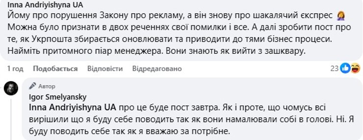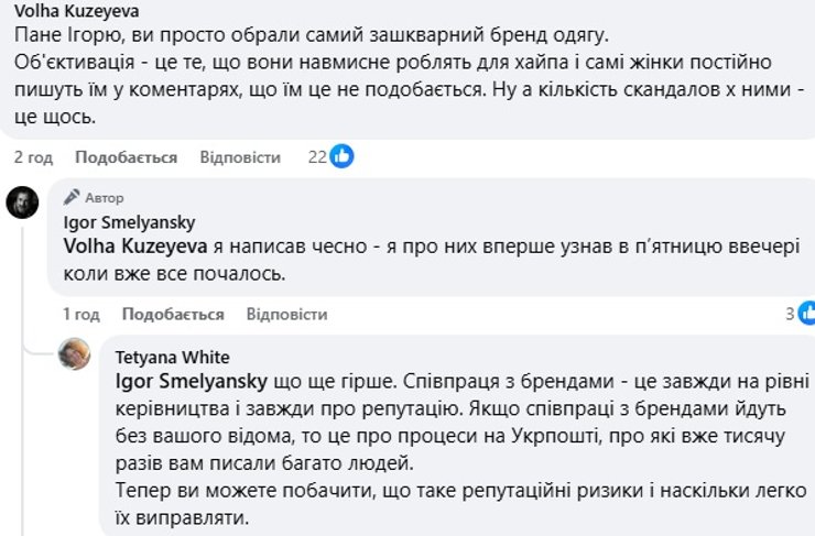 "Это же надо так извиниться, что в каждом предложении — шпилька. Whataboutизм во всей красоте. И это кто-то писал! Вот просто интересно, кто-то скажет главе государственной компании, что так нельзя", "как "извиниться" и обвинить всех, кроме действительно виновных — мастер-класс в одном сообщении", "Сотрудничество с брендами – это всегда на уровне руководства и всегда о репутации. Если сотрудничество с брендами идут без вашего ведома, то это о процессах на Укрпоште, о которых уже тысячу раз вам писали многие", "Ему о нарушении Закона о рекламе, а он снова о шакальем экспрессе. Можно было признать в двух предложениях свои ошибки и все. А дальше сделать пост о том, как Укрпошта собирается обновлять и приводить в чувство бизнес процессы. Наймите сознательного пиар менеджера. Они знают, как выйти из зашквара", — пишут под постом.