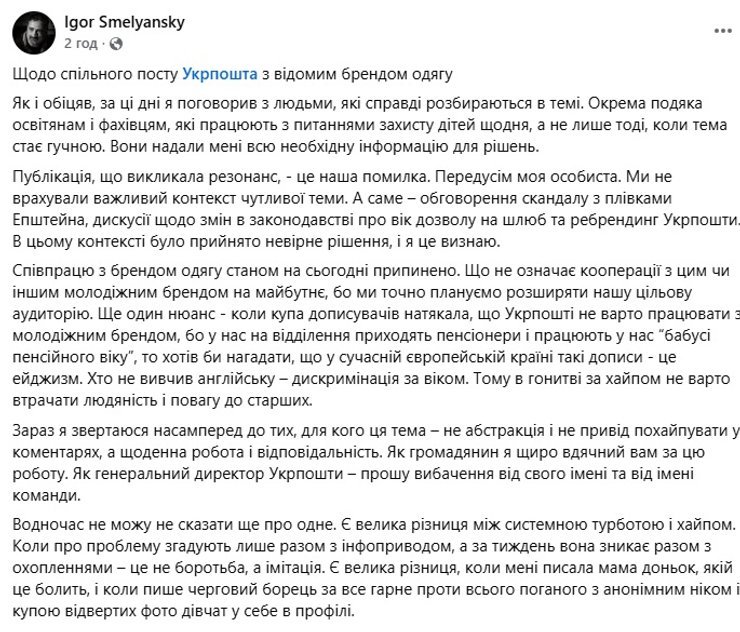 "Мы не учли важный контекст чувствительной темы. А именно — обсуждение скандала с пленками Эпштейна, дискуссии по поводу изменений в законодательстве о возрасте разрешения на брак и ребрендинг Укрпошты. В этом контексте было принято неверное решение, и я признаю это", — говорится в публикации.
