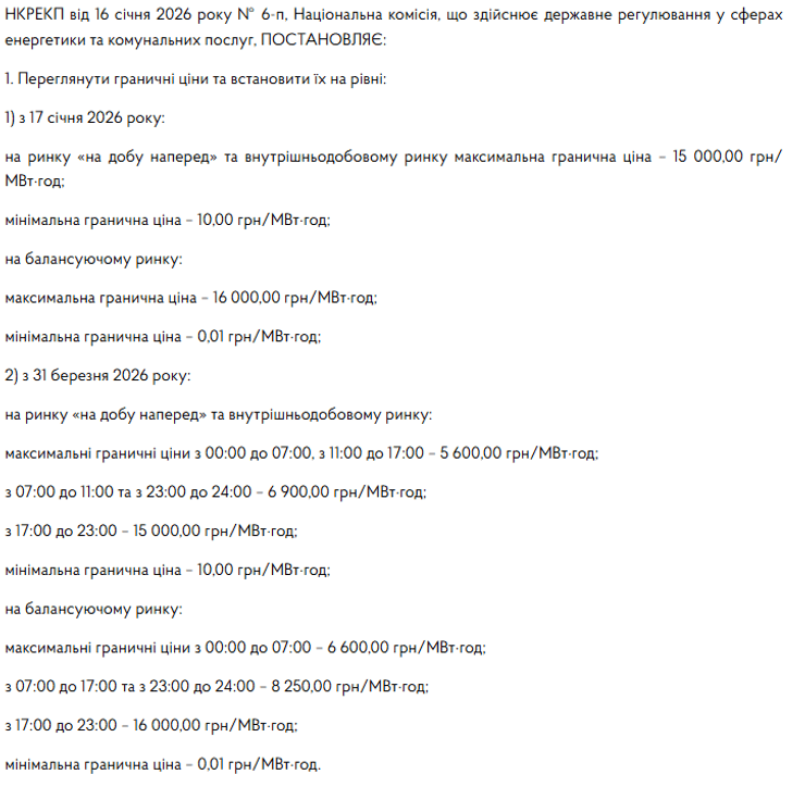 Рост цен на электроэнергию обусловлен постановлением №70 Национальной комиссии, осуществляющей государственное регулирование в сферах энергетики и коммунальных услуг (НКРЭКУ), от 16 января 2026 года "О предельных ценах на рынке "на сутки вперед", внутрисуточном рынке и балансирующем рынке".