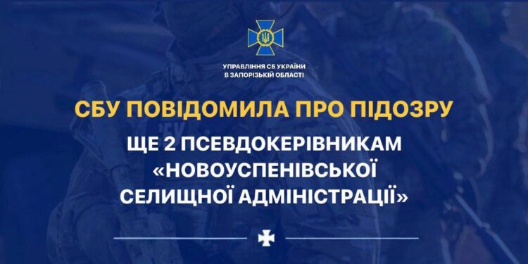 Співробітники Служби безпеки України встановили і зібрали доказову базу відносно ще 2 колаборантів, які допомагають країні-агресору встановлювати та підтримувати окупаційний режим на тимчасово окупованих територіях Запорізької області. Зокрема, слідчі СБУ повідомили про підозру колишньому землевпоряднику Новоуспенівської ОТГ, який з початком російської агресії схвалював дії окупантів та усіляко їм сприяв. За це його було призначено на посаду голови так званої «Новоуспеновской сельськой администрации Мелитопольского района Запорожскойобласти».Перебуваючи на посаді, він в першу чергу посилив податкове навантаження на підприємців району з метою фінансування незаконної адміністрації та представників країни-агресора, за його наказом окупантам були надані права на управління захопленими об’єктами житлово-комунального господарства, побутового, торговельного обслуговування, транспорту і зв’язку, що перебувають у комунальній власності.Також, на виконання вказівки окупаційної влади, він організував та забезпечив процес примусової паспортизації мешканців Новоуспенівськоїтериторіальної громади.Другий функціонер – голова колишньої Запорізької сільської ради Веселівського району, який займав цю посаду з 2002 по 2014 рік, з перших днів окупації пішов на співпрацю з агресором. За це його призначили заступником голови «Новоуспеновской администрации». Оскільки він вже має досвід перебування на керівній посаді, він допомагає новоспеченому голові у керівництві громадою.Також, встановлено, що у вересні 2022 року, діючи на виконання вказівок окупаційної влади та за підтримки збройних формувань рф, зрадники особисто провели комплекс заходів для підготовки та організації проведення псевдореферендуму на тимчасово окупованих територіях.На підставі зібраних доказів слідчі УСБУ в Запорізькій області повідомили фігурантам про підозру за ч. 5 ст. 111-1 (колабораційна діяльність) Кримінального кодексу України. Наразі зловмисники переховуються на тимчасово окупованих територіях Запорізької області, але співробітники СБУ проводять комплексні заходи для притягнення їх до відповідальності. У мирні та воєнні часи залишаємося разом, бо лише так ми є сильнішими. Долучайтеся до телеграм каналу Форпост медіа. Усі ми тут — https://t.me/forpost_zp