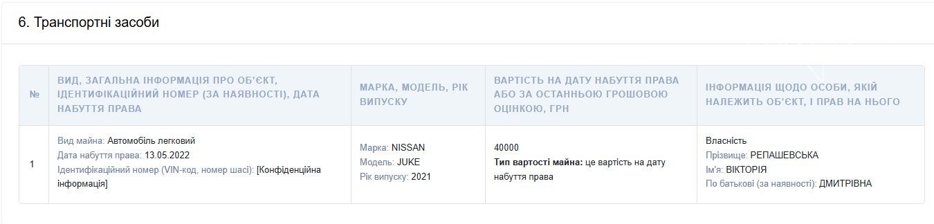 В 2024 году Репашевская увеличила сбережения и указала, что теперь держит наличными 200 тысяч гривен и 11 тысяч долларов. На банковском счету у нее 24 тысячи гривен.