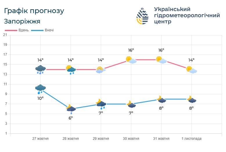 С 28 октября по 1 ноября на погоду в Запорожье будет влиять активный циклон, который вызовет переменчивую погоду. В Запорожском областном центре гидрометеорологии отмечают, что 28-29 октября в городе выпадут небольшие дожди, местами умеренные. Дальше ожидается теплая погода без осадков.
