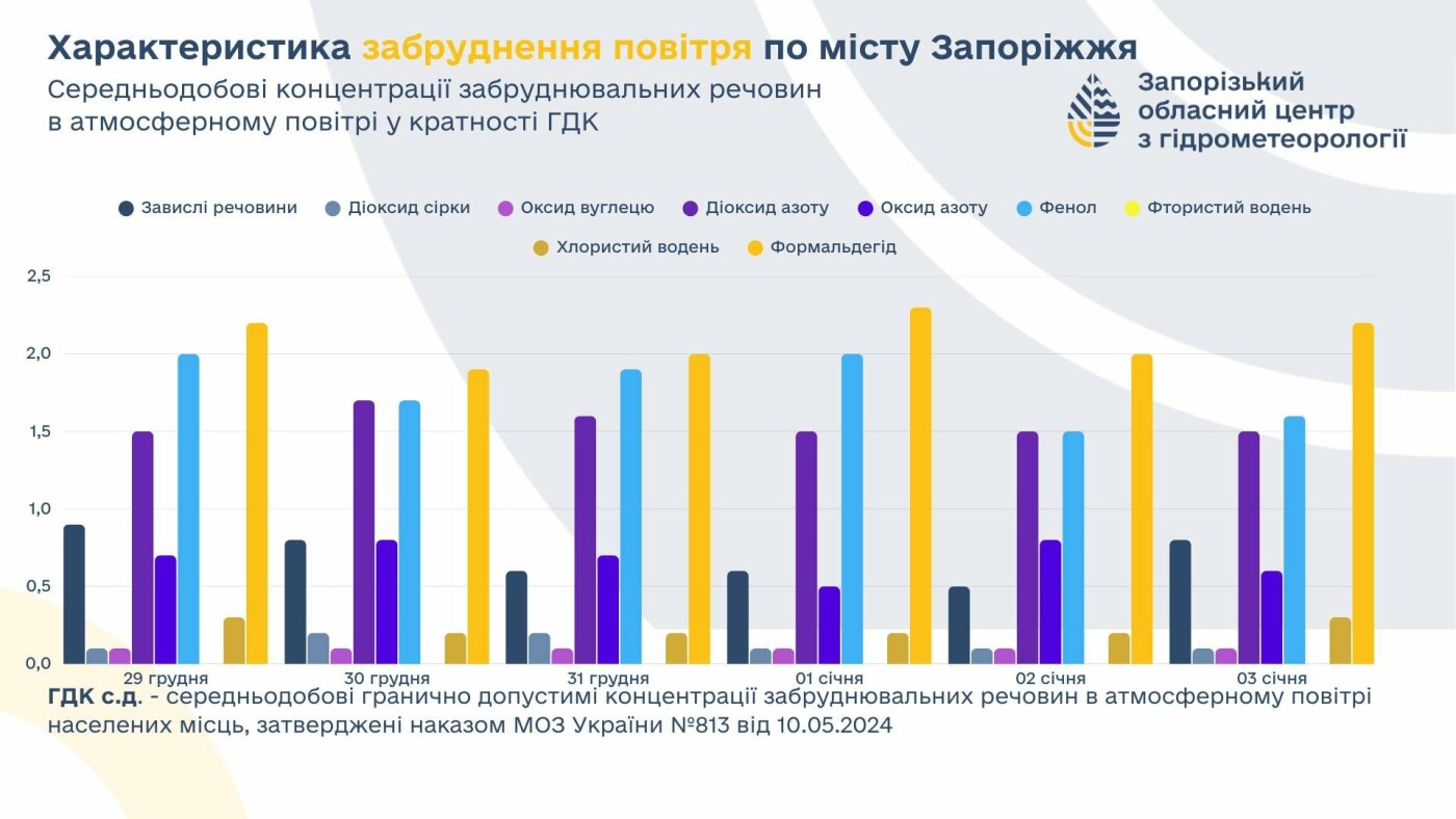 С 29 декабря по 3 января в Запорожье лаборатория областного центра гидрометеорологии проводила исследование загрязнения атмосферного воздуха. Как сообщили в ЗЦГМ, зарегистрировано превышение допустимой среднесуточной предельно допустимой концентрации вредных веществ по ряду показателей.