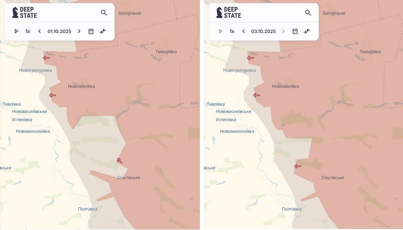 Российские оккупанты заняли села Ольговское в Запорожской области, а также Березовое и Калиновское в Днепропетровской области. Также противник продвинулся у Новоивановки Запорожской области, Вороного и Вербового Днепропетровской области. Об этом сообщил OSINT-проект DeepState 2 и 3 октября.