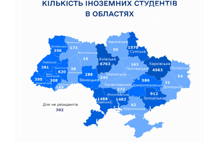 В заведениях высшего образования Украины учатся граждане из 127 стран мира. Больше всего студентов из Китая, Азербайджана, Грузии, Индии, Марокко, Турции, Туркменистана, Польши, Армении и РФ.