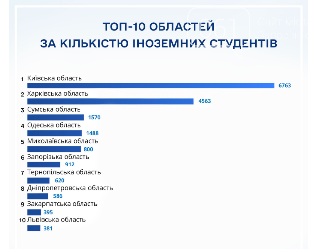 Лидером традиционно остается Киевская область (6763 студента), далее – Харьковская (4563) и Сумская (1570). Запорожский регион опередил Тернопольскую, Днепропетровскую, Закарпатскую и Львовскую области.